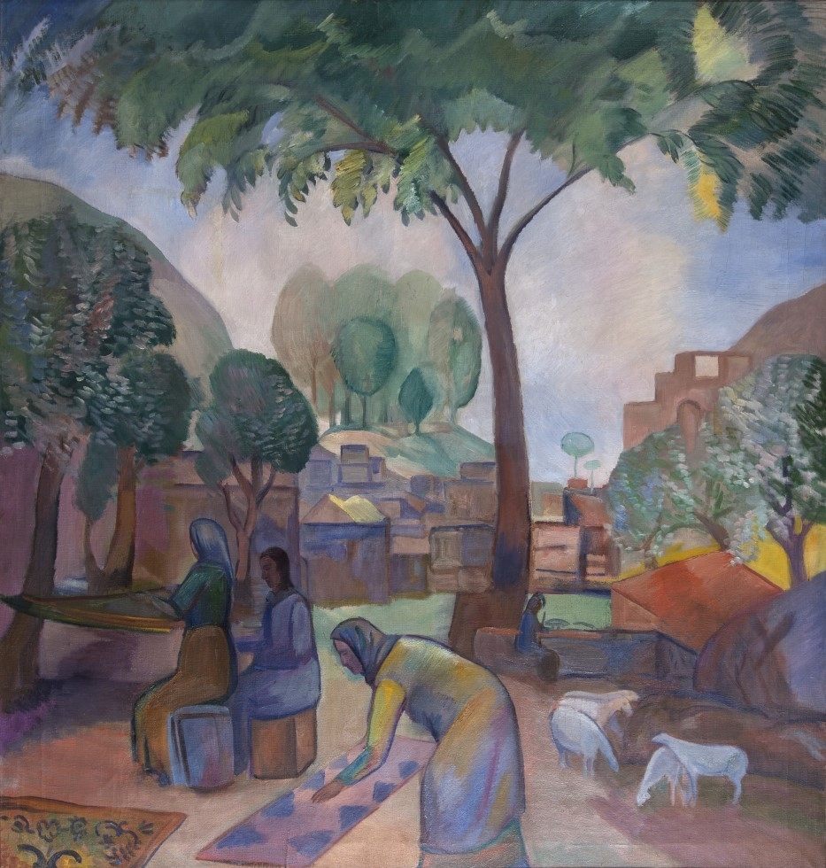 Художник строит композицию на плавной ритмике и тонких цветовых переходах. Женщина, чистящая ковер, своим силуэтом вторит изогнутому стволу и кроне дерева, а те, в свою очередь, перекликаются с линией холмов. Свет заливает холст ровно, без контрастов, связывая все в единое целое. Люди, животные, предметы и природа существуют на полотне в одном ритме.