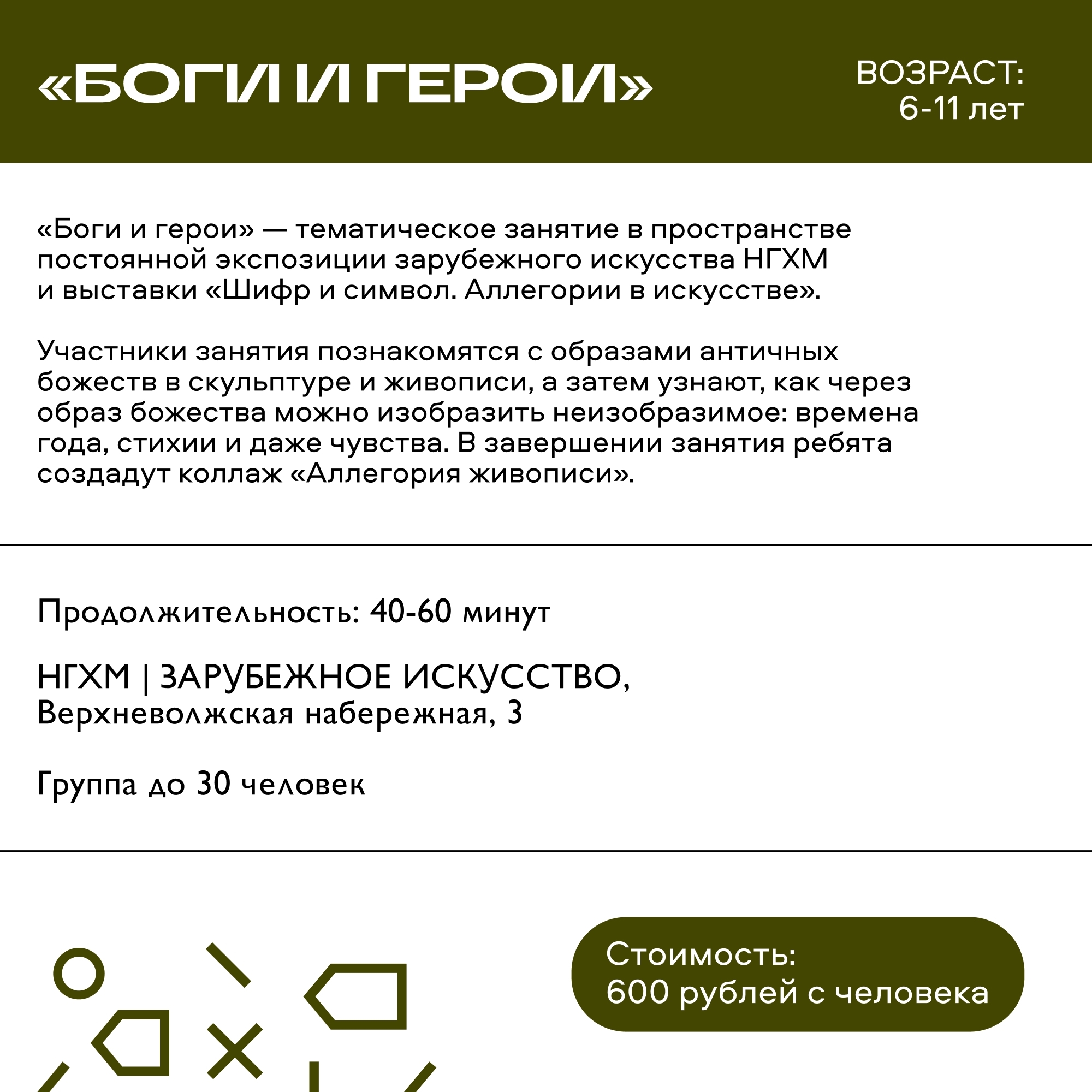 Для детей 6–11 лет — занятие «Боги и герои»: знакомство с образами античных богов в живописи и скульптуре, создание яркого коллажа.