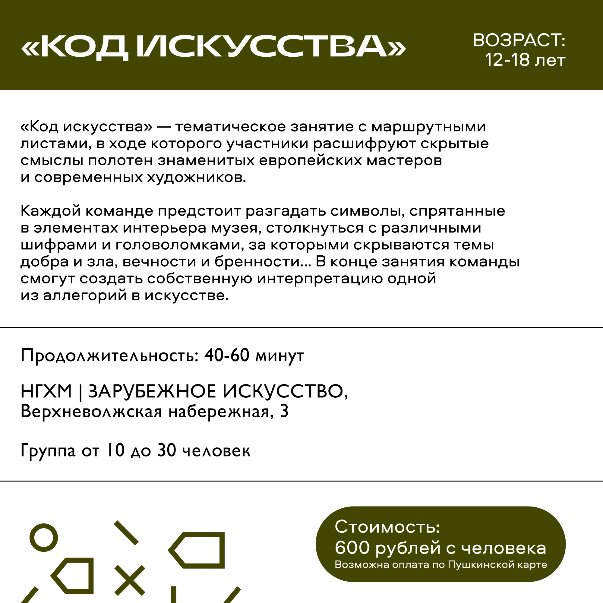 Для подростков 12+ — интерактив «Код искусства»: команды расшифровывают скрытые символы в картинах, разгадывают шифры и создают свои аллегории.