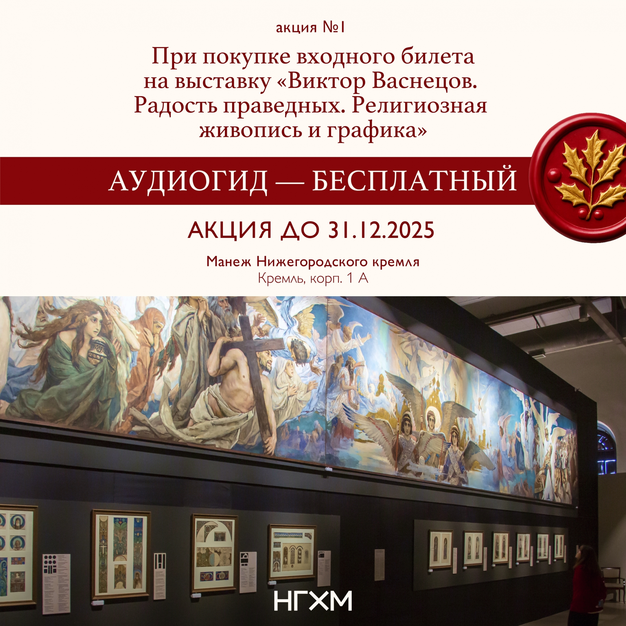 Так, при покупке билета на выставку «Виктор Васнецов. Радость праведных. Религиозная живопись и графика» в Манеже Нижегородского кремля (Кремль, 1А) посетители получат в подарок аудиогид с подробным рассказом о творчестве великого художника. Это возможность самостоятельно исследовать экспозицию, услышать историю создания работ и выстроить комфортный маршрут для просмотра. Акция будет действовать до 31 декабря 2025.