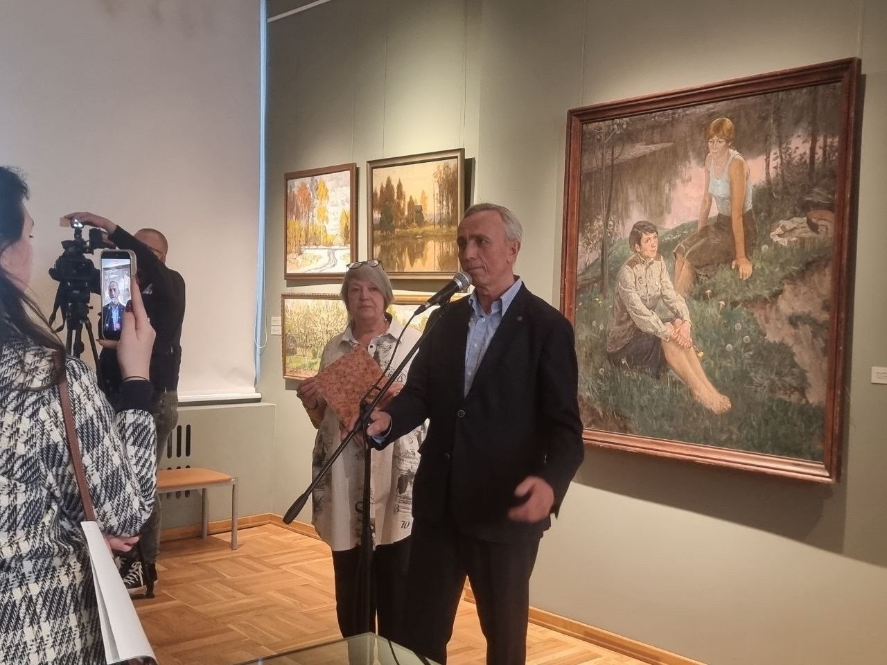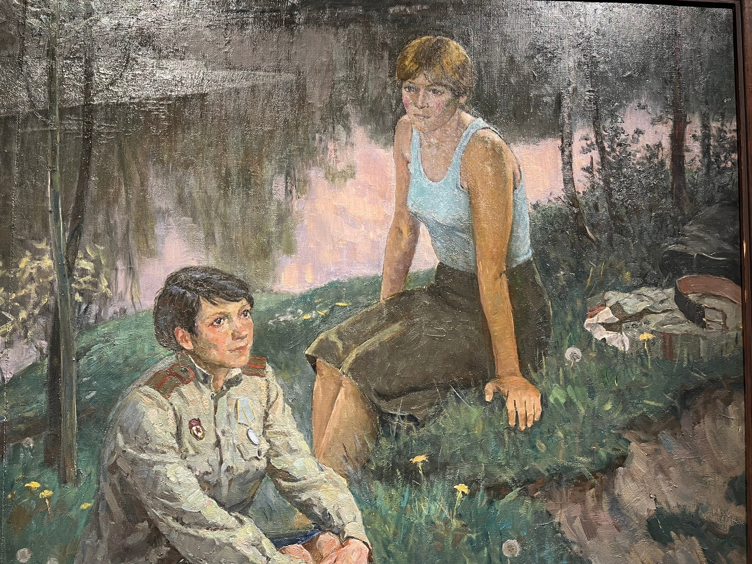 Хотя большая часть жизни художника была связана с армией, главной темой его творчества стало лирическое воспевание мирной жизни: природа в тонких состояниях, натюрморты с богатством цвета и фактур, портреты с глубоким проникновением в характер. Из военных работ на выставке представлена только одна – «Весна 45-го» (1993, собрание НГХМ). В ней художник создаёт образ долгожданной Победы: девушки наслаждаются миром и полны юных надежд. И всё же зритель ощущает щемящую хрупкость и беззащитность тех, кто прошёл через войну.