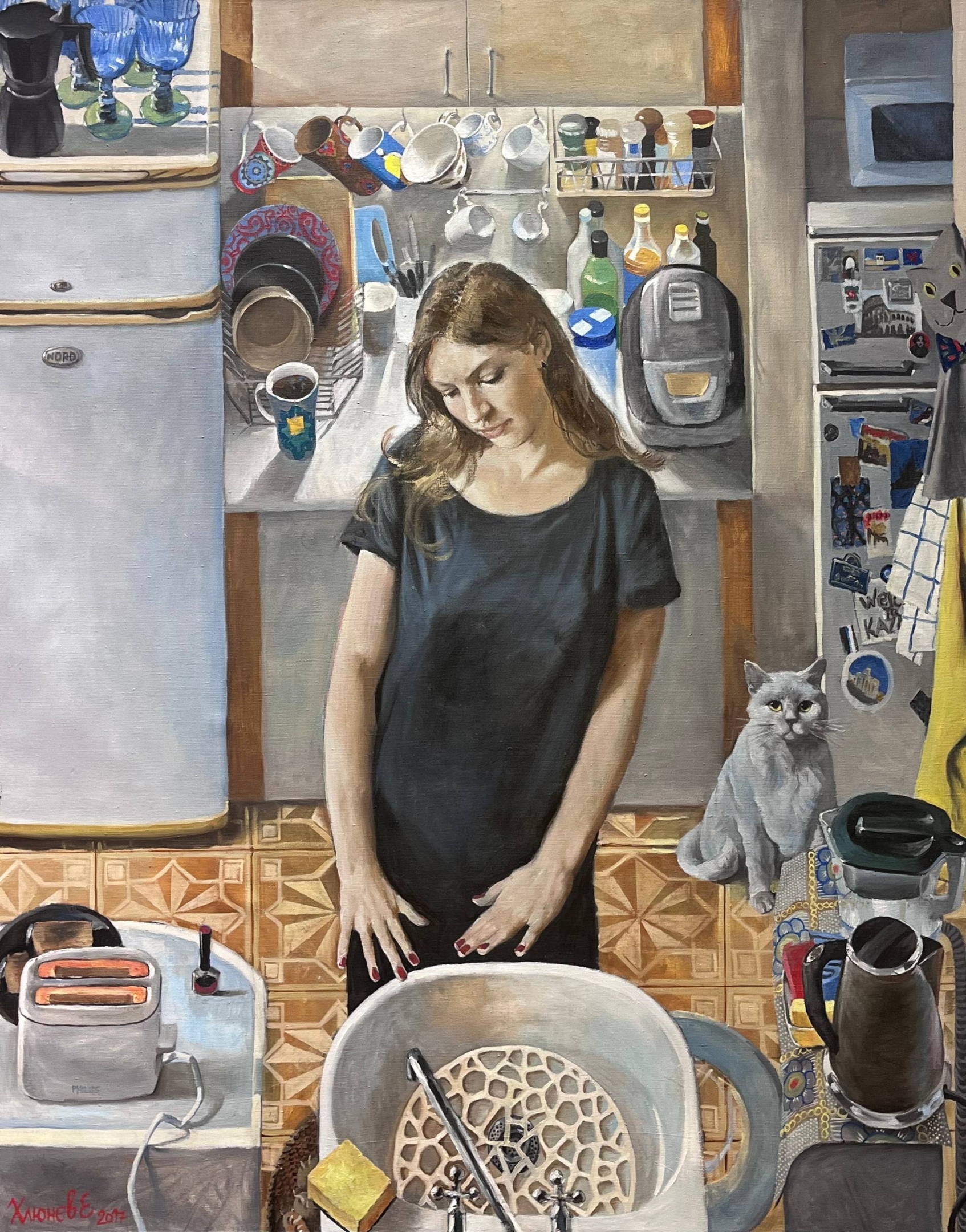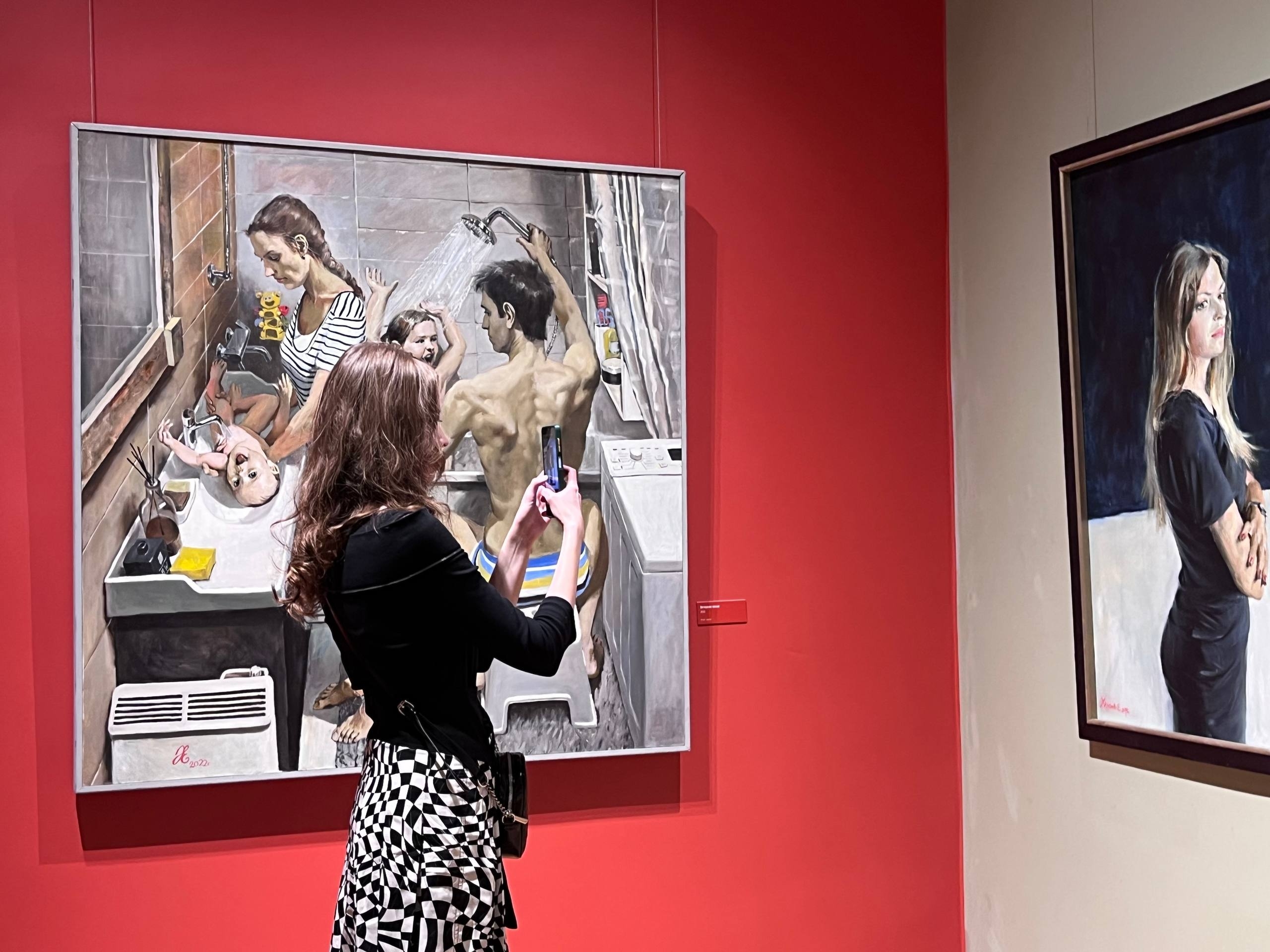В творчестве Евгения Хлюнева классический живописный язык оживает благодаря актуальным темам: художник обращается к повседневным сценам, портретам современников, индустриальному и городскому пейзажам. Он мастерски ловит юмор в бытовых зарисовках из жизни: от детских шалостей до «тягот» ежедневного выбора, как в картине «Мыть или не мыть».