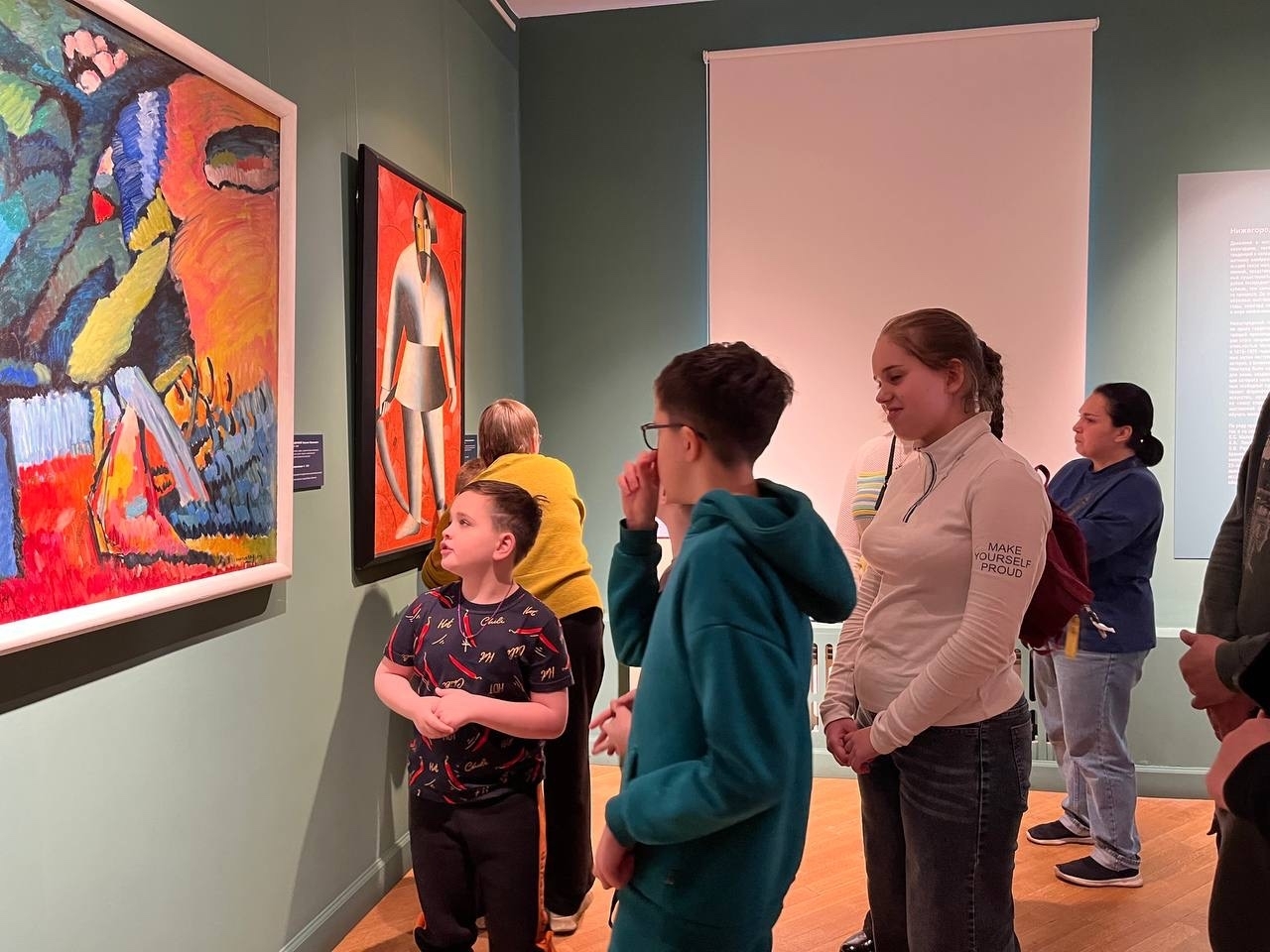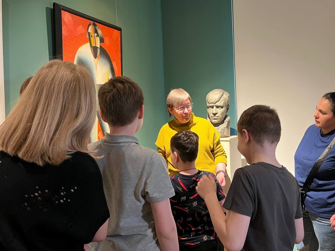 В ИЗОстудии для детей с РАС в этот день прошло необычное занятие. Ребята изучили три шедевра из постоянной экспозиции – «Косаря» Казимира Малевича, «Импровизацию №4» Василия Кандинского и «Белок» Натальи Гончаровой.