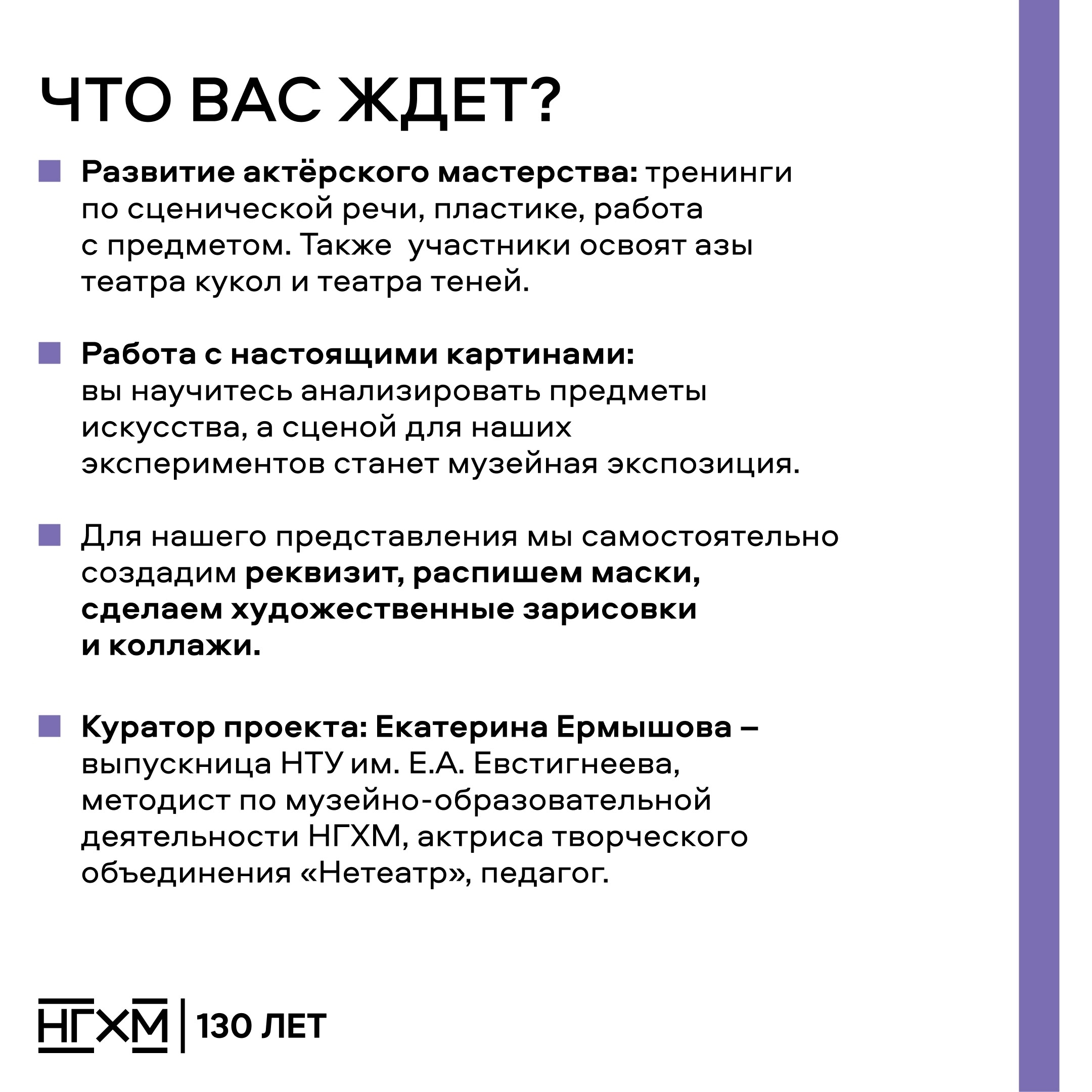 Куратор проекта: Екатерина Ермышова - выпускница НТУ им. Е.А. Евстигнеева, методист по музейно-образовательной деятельности НГХМ, актриса творческого объединения "Нетеатр", педагог.