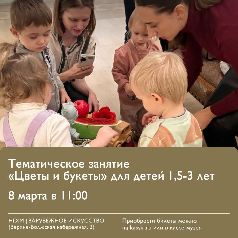 На занятии дети будут искать цветы в интерьерах здания и на фарфоровых вазах, посмотрят натюрморты и даже сами соберут букет из прекрасных цветов!
