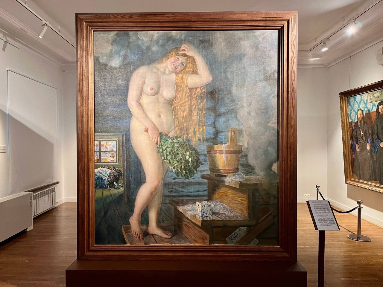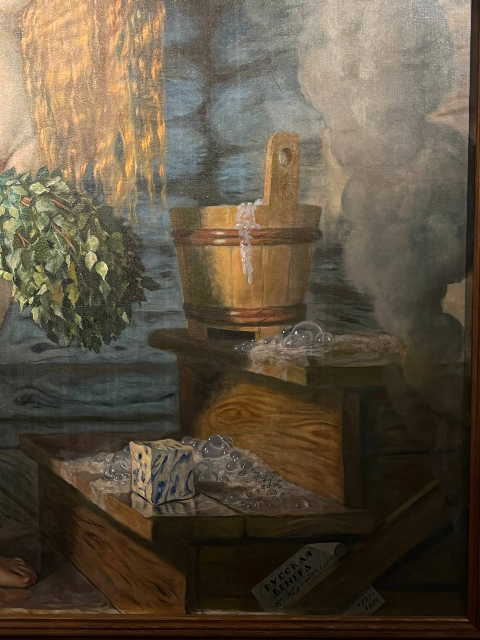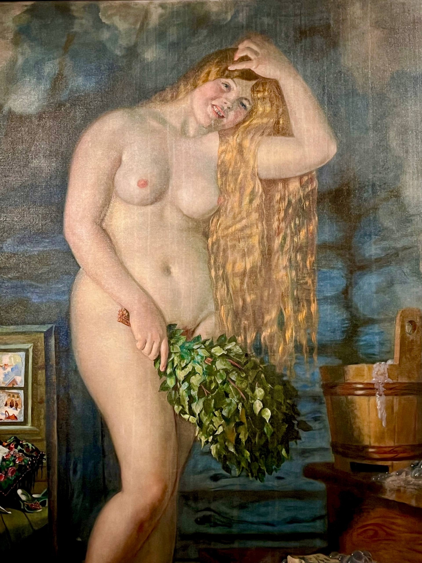 Эта картина — особенная. Написанная в 1925-1926 годах, она стала одной из последних крупных работ Бориса Кустодиева. У неё есть и своя тайна: «Русская Венера» создана на обороте другого полотна — «На террасе» (1906), где художник изобразил свою семью за чаепитием.
