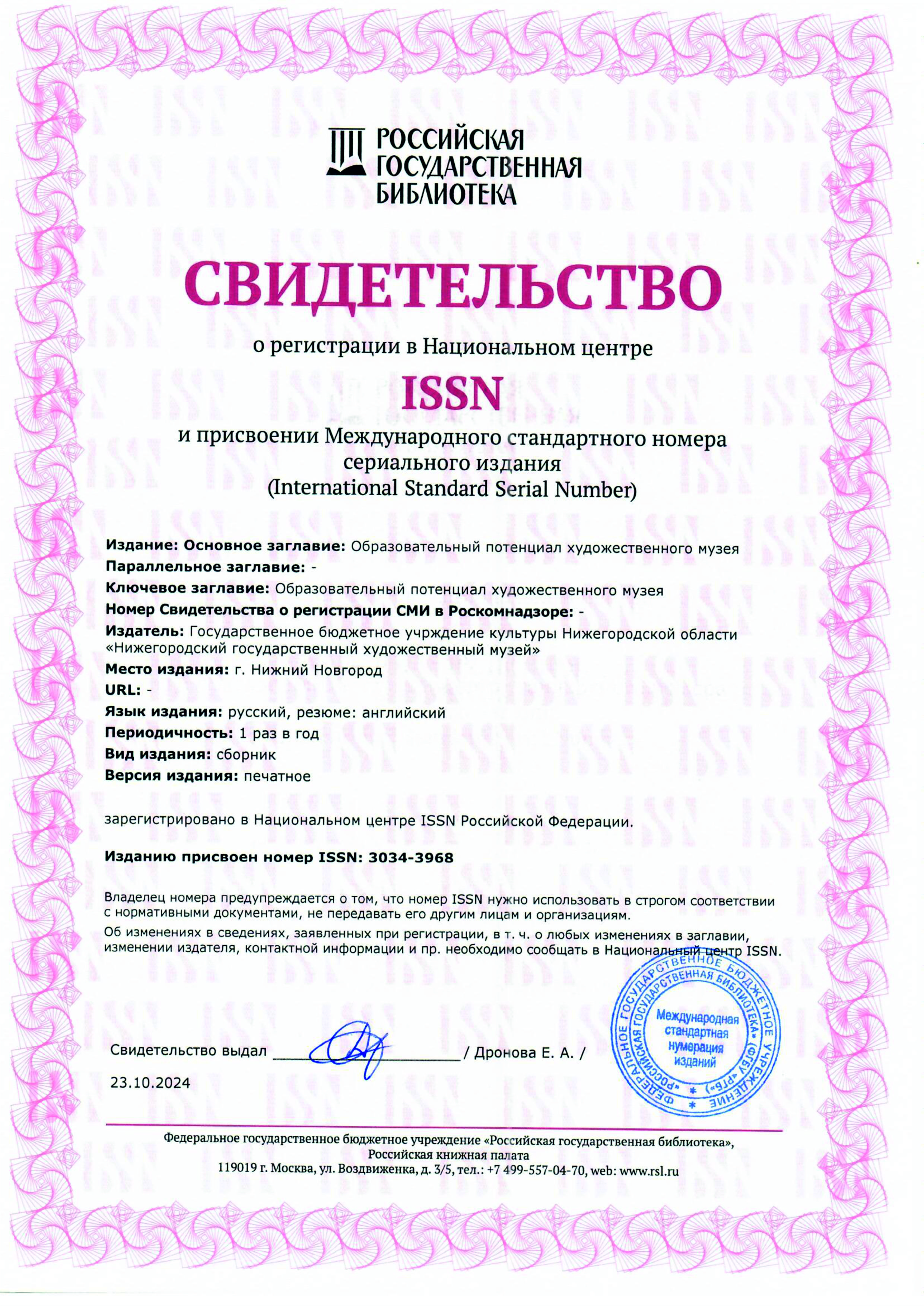 Журнал «Образовательный потенциал художественного музея» представляет собой сборник материалов одноименной конференции, проводимой Нижегородским государственным художественным музеем и МАОУ “Гимназия №13” г. Нижнего Новгорода.